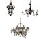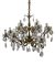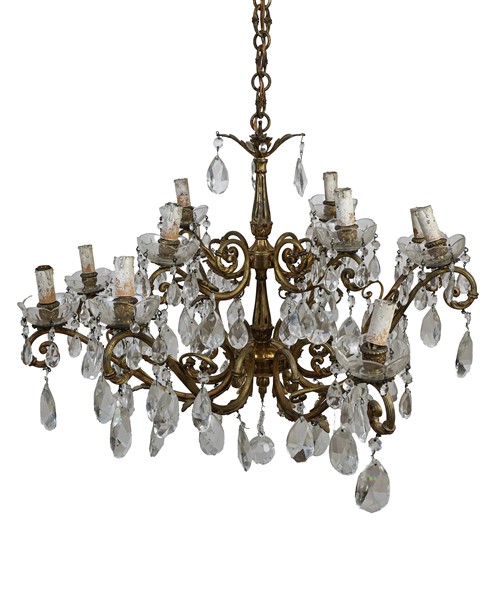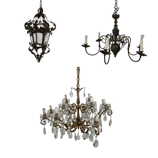 Lotto composto da una lanterna esagonale in metallo con decori in lamierino sagomato a foglie, e due diversi lampadari con strutture in metallo e pendagli in vetro sfaccettato (d max cm 83) (difetti e mancanze)