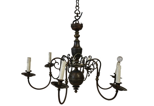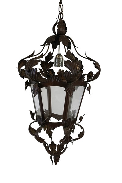 Lotto composto da una lanterna esagonale in metallo con decori in lamierino sag