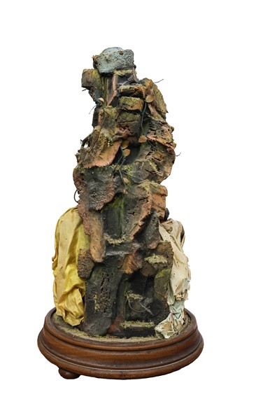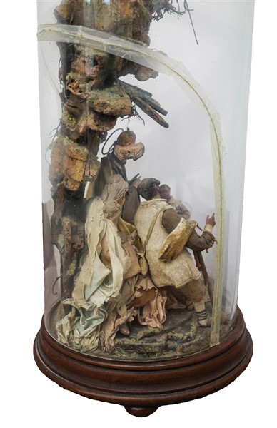 Arte napoletana, secolo XIX. Presepe in terracotta dipinta e materiali vari con abiti in tessuto. Base in legno e campana in vetro. (gravi difetti e mancanze) (h tot cm 71)