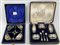 Lotto composto un cruet in argento di forma ovale, Londra, 1797 con ampolle in vetro molato non coeve; un set da tavola in argento Sheffield, 1923-1924 composto da coppia di saliere, una mostardiera con interni in vetro blu due salini a balaustro e tre diversi cucchiaini d'epoca diversa in custodia (g pesabili 250) uniti ad una alzata ovale in metallo argentato con decoro floreale e cartiglio a rilievo ed un set con quattro saliere in metallo argentato entro custodia (difetti)