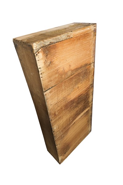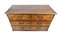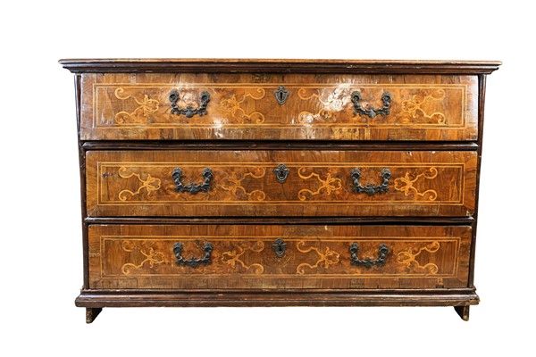 Cassettone in noce con fronte lastronato e filettato in legni vari a tre casset