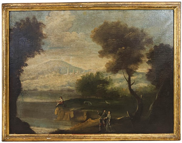 Lotto 2008 | Ignoto Antico dipinto raffigurante "Paesaggio con figure" olio su tela (cm 70x