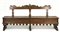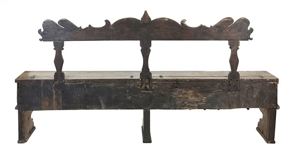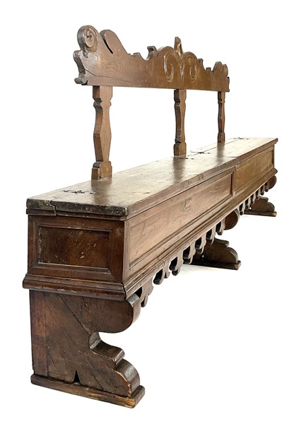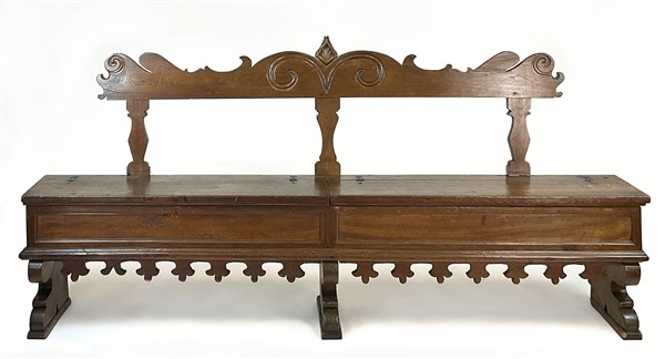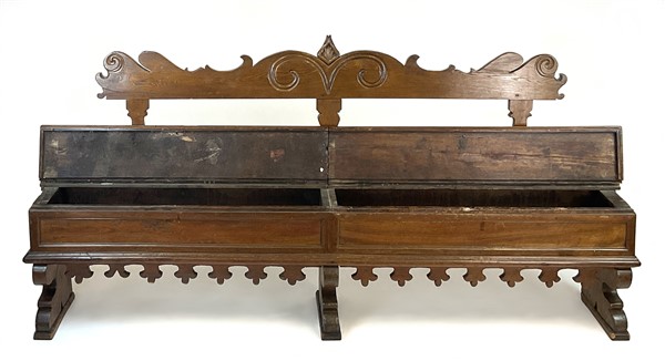 Antica panca da parete in legni vari con schienale sagomato e scanalato, doppia seduta incernierata, grembiale con profili dentellati (cm 233x120x33) (difetti)