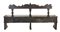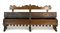 Antica panca da parete in legni vari con schienale sagomato e scanalato, doppia