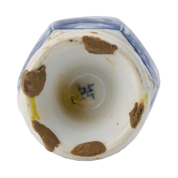 Piccolo vaso con coperchio a cupola decorato in blu a pannelli con motivi flore