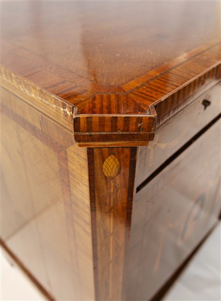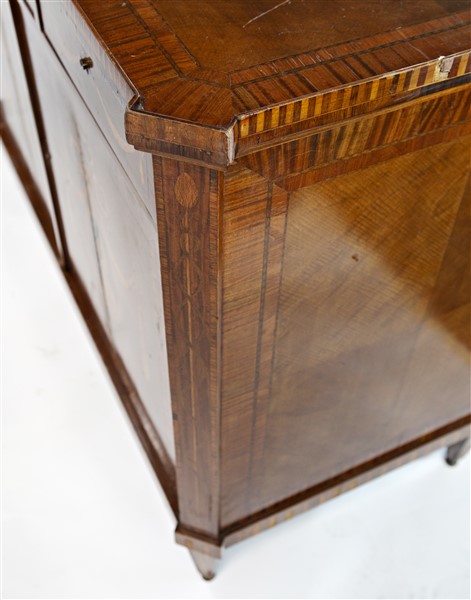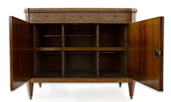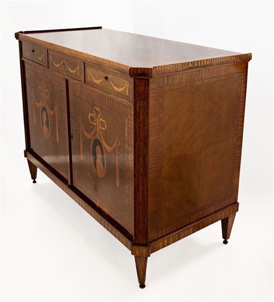 Credenza a due ante e tre cassetti sottopiano impiallacciata in mogano ed intarsiata in legni di varie essenze con profili entro medaglioni retti da festoni e nastri, gambe ad obelisco rovesciato. Nord Europa, secolo XIX (cm 119x94x57) (difetti e mancanze)