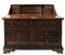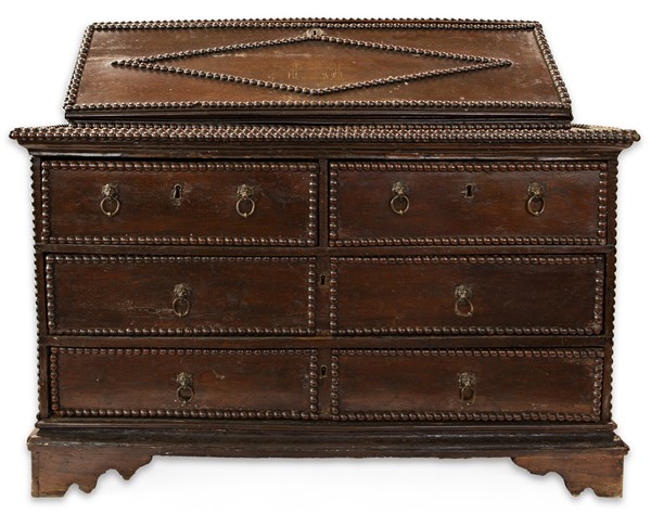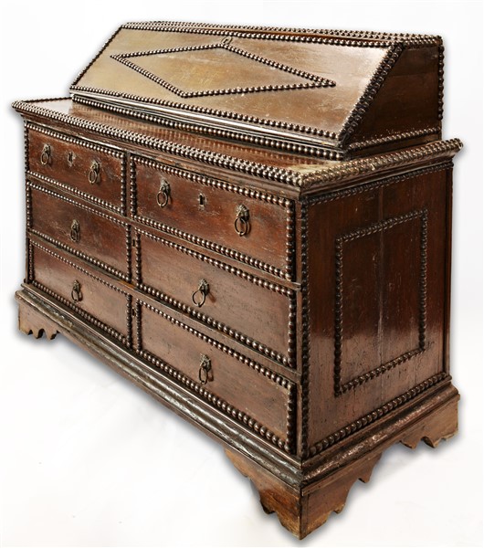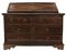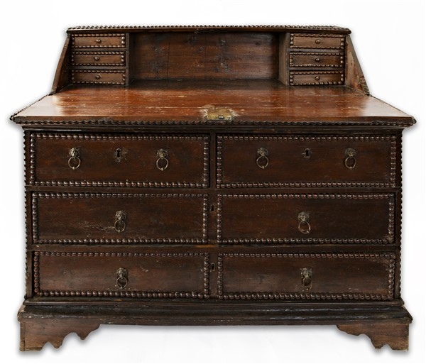 Ribalta in noce con bordure bugnate, fronte a quattro cassetti di cui due allineati sottopiano, calatoia celante sei tiretti e vano a giorno con sportellino incernierato, maniglie ad anello con attaccatura a testa leonina, piedi a mensola. Spagna, secolo XVIII (cm 148x118x62) (difetti e restauri)
