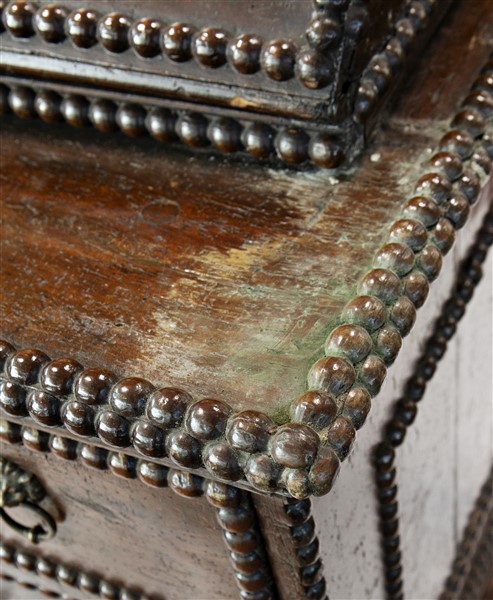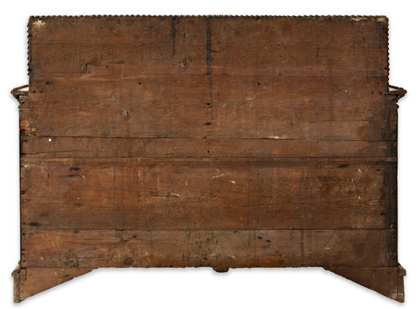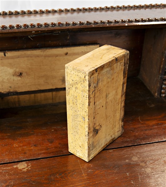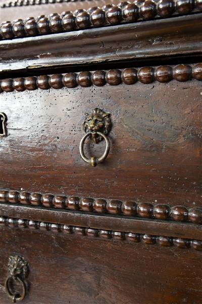 Ribalta in noce con bordure bugnate, fronte a quattro cassetti di cui due allin