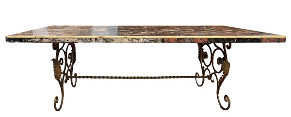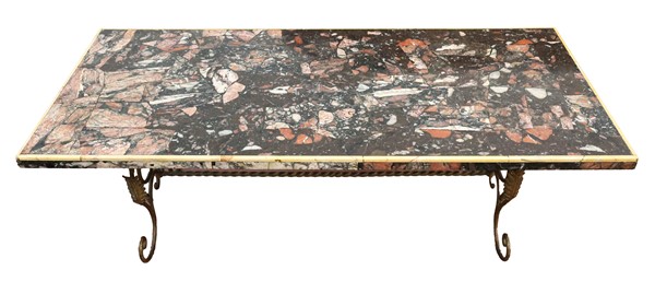 Tavolino da salotto con piano rettangolare in breccia e profili in marmo giallo, struttura di sostegno in ferro battuto e dorato (cm 140x47,5x63) (difetti)