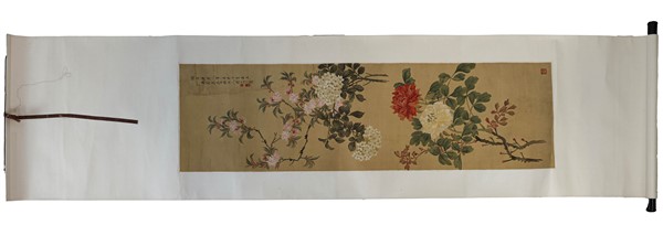Due scroll, inchiostro su seta, uno raffigurante fiori, l'altro raffigurante ba