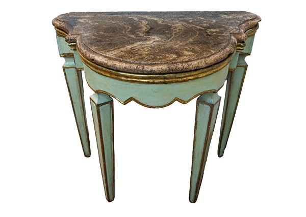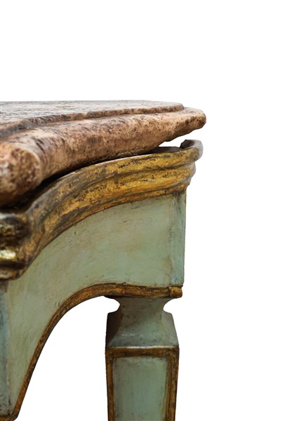 Console di forma sagomata in legno dipinto, laccato e dorato, quattro piedi a obelisco rovesciato, piano in marmo. Secolo XVIII (cm 85x80x54) (difetti)