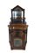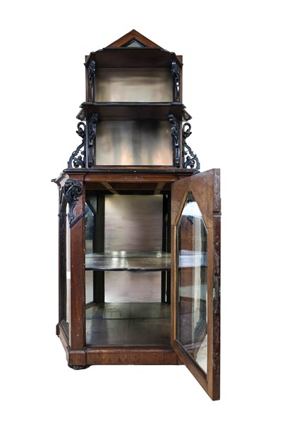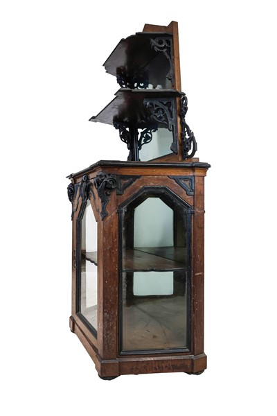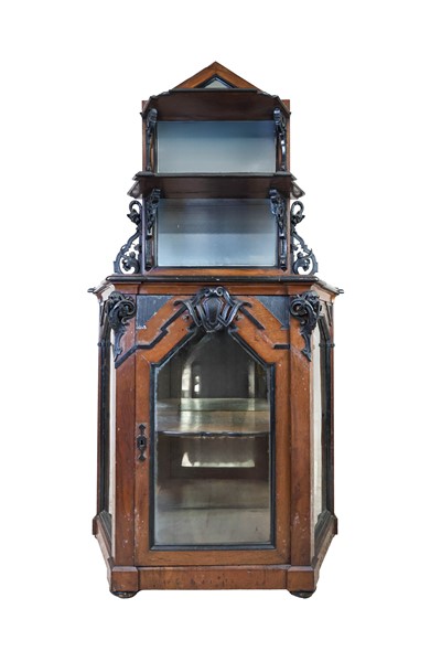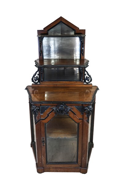 Vetrina lastronata in noce con alzata a specchio e doppia mensola, parte inferiore a due ripiani con anta e fianchi a vetro, profili ebanizzati. Fine secolo XIX (cm 86x162x42) (difetti)