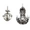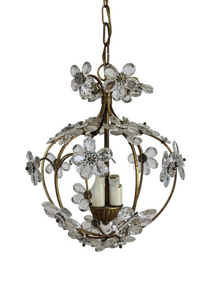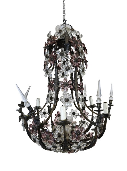 Lotto composto da un lampadario a sei luci con struttura a cesto in metallo, decorato da margherite con petali in cristallo incolore e ametista e puntali retti da amorini assisi (d cm 65, h cm 85), ed un lampadarietto a tre luci di simile decoro (difetti e mancanze)