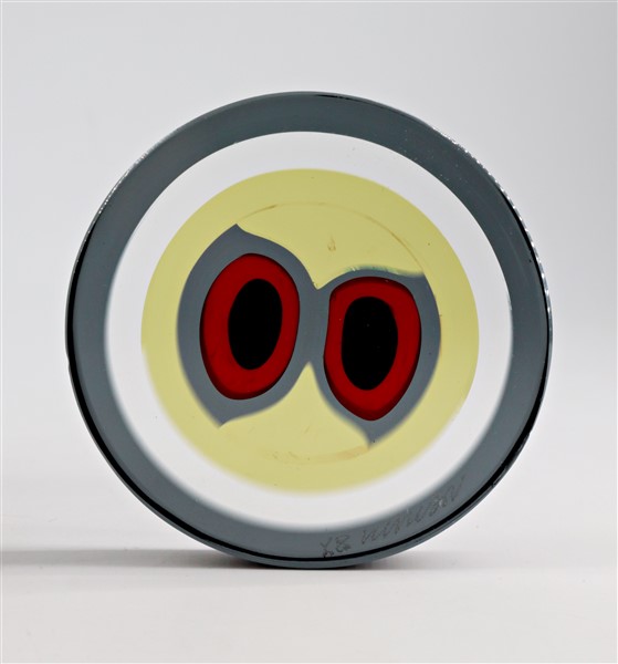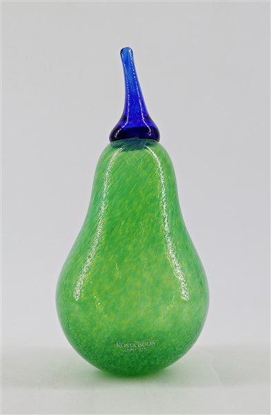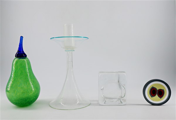 Lotto composto da un portacandela in vetro soffiato trasparente incolore con orlo azzurro di manifattura muranese, una pera in vetro della manifattura Kosta Boda, un posacenere in vetro trasparente incolore e un tondo a murrine in vetro firmato a punta "Venini 87". Seconda metà secolo XX. (h max cm 20) (lievi difetti)