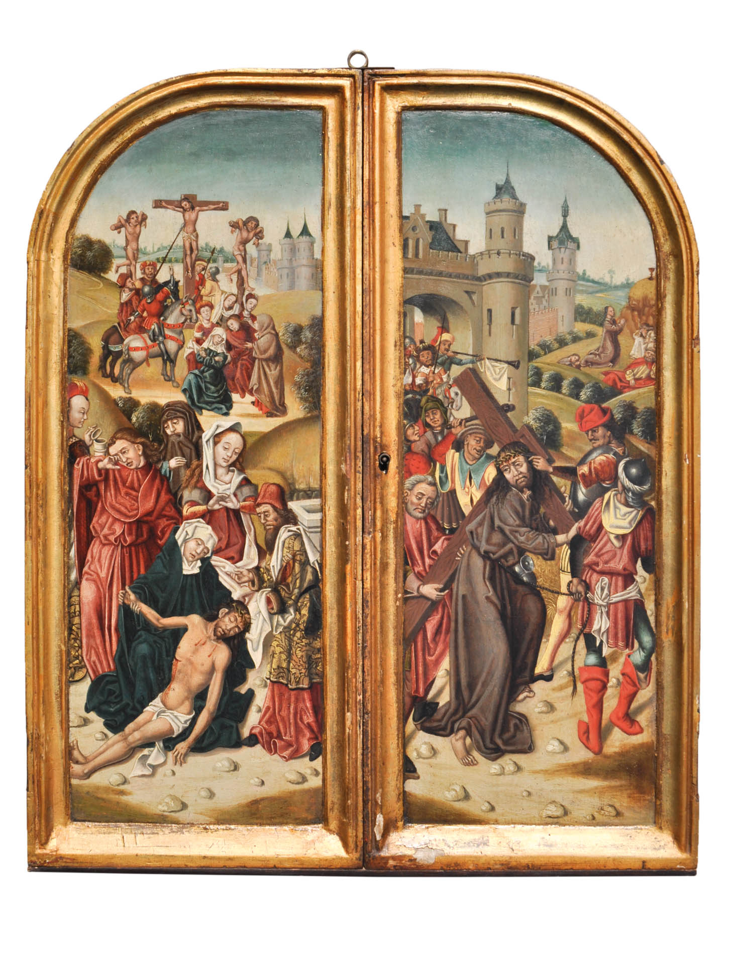 Deutsch, um 1480/Germania, 1480 ca. Due pannelli dipinti su entrambi i lati con scene cristologiche;(ali di una pala d'altare domestica)
