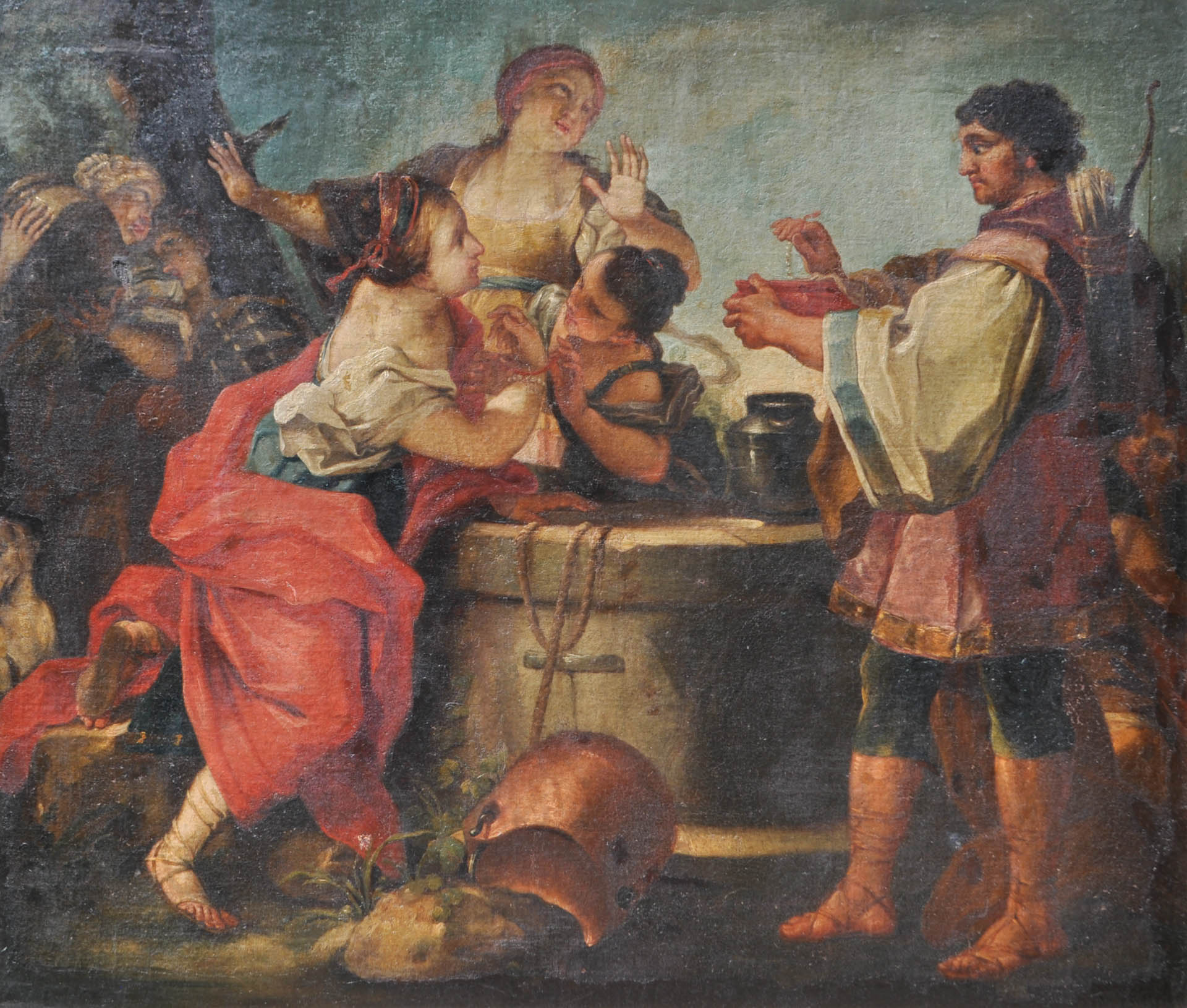 Veroneser Maler des 18. Jh./Pittore veronese del XVIII secolo Rebecca ed Eliezer al pozzo;Olio su tela, 92 x 147 cm, rintelato, ritocchi, in cornice