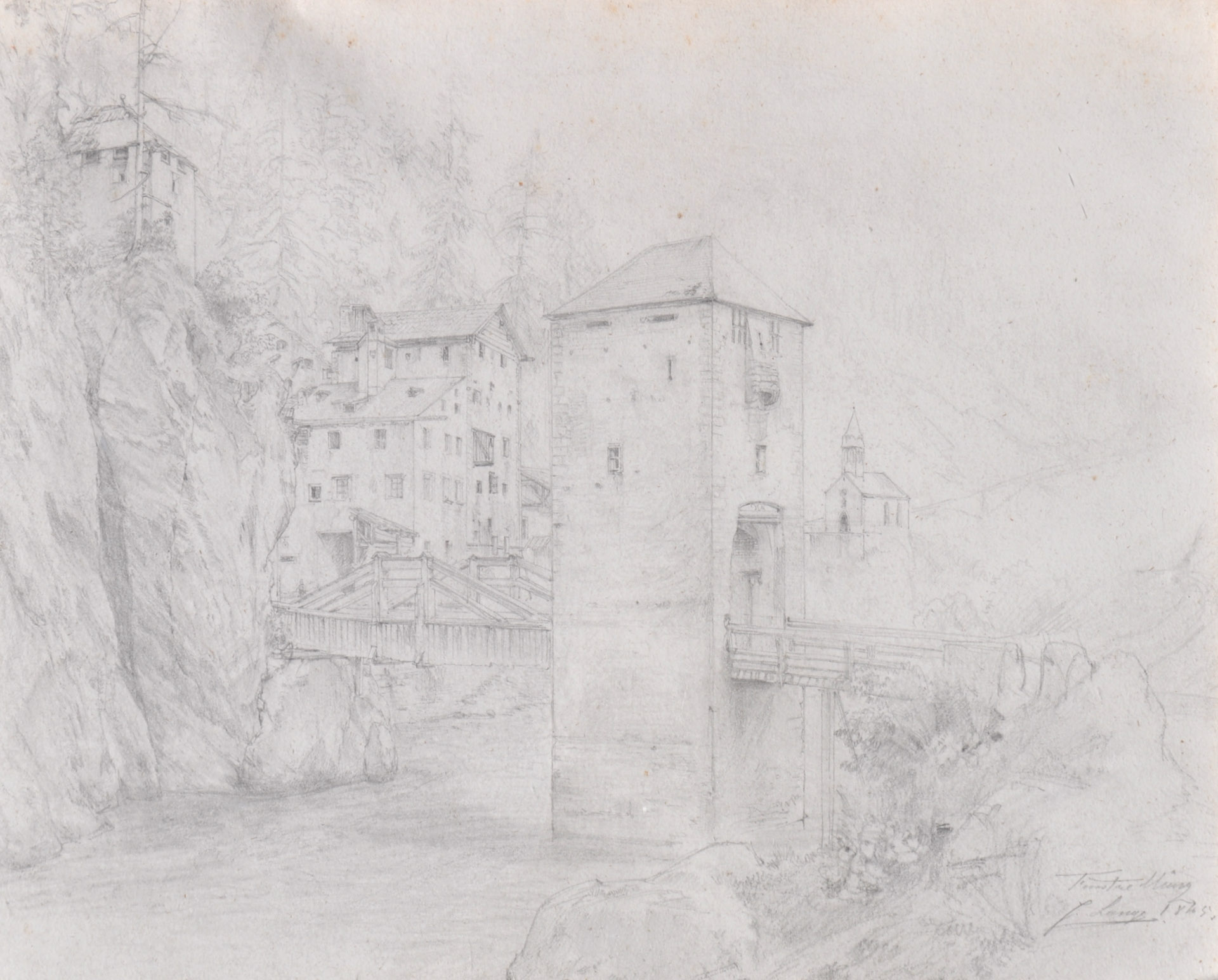 Julius Lange (Darmstadt 1817 - München/Monaco di Baviera 1878) Finstermünz, 1845;Matita, 38,5 x 47 cm, in cornice