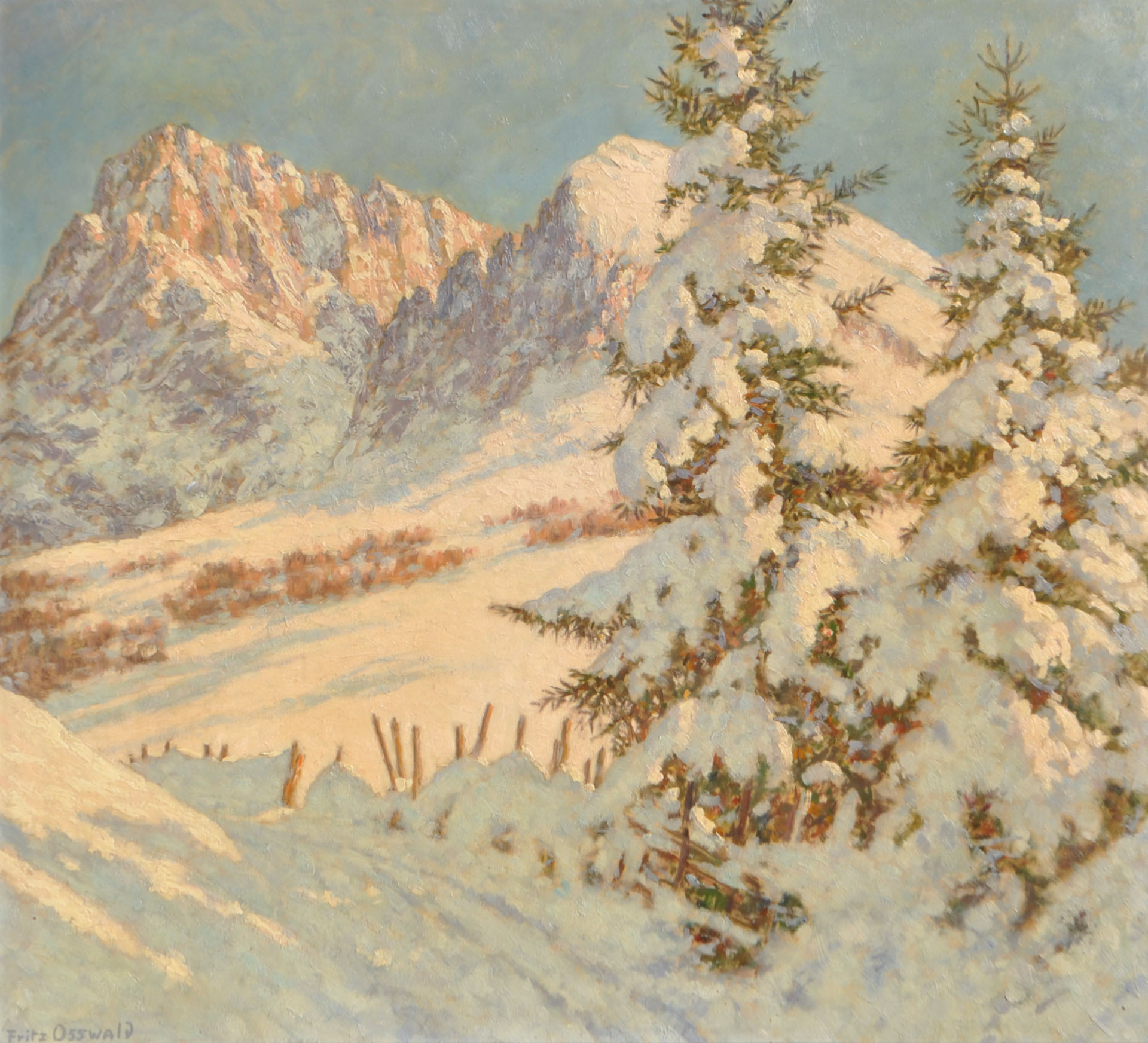 Fritz Osswald (Zürich/Zurigo 1878 - Starnberg,1966) Alpe di Siusi con il Sassolungo, 1920 ca.;Olio su cartone, 71 x 78 cm, cornice originale