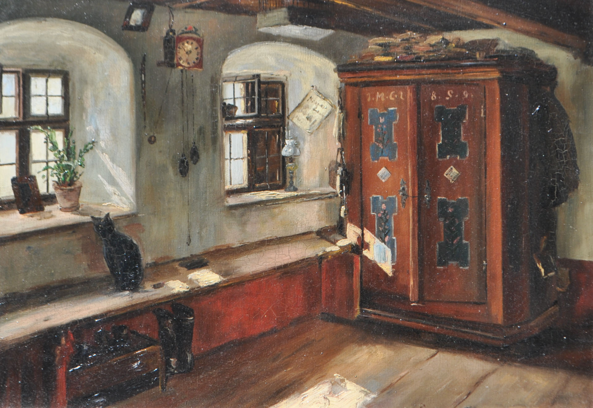 Thomas Walch (Imst 1867 - 1943) Stube tirolese con gatto nero;