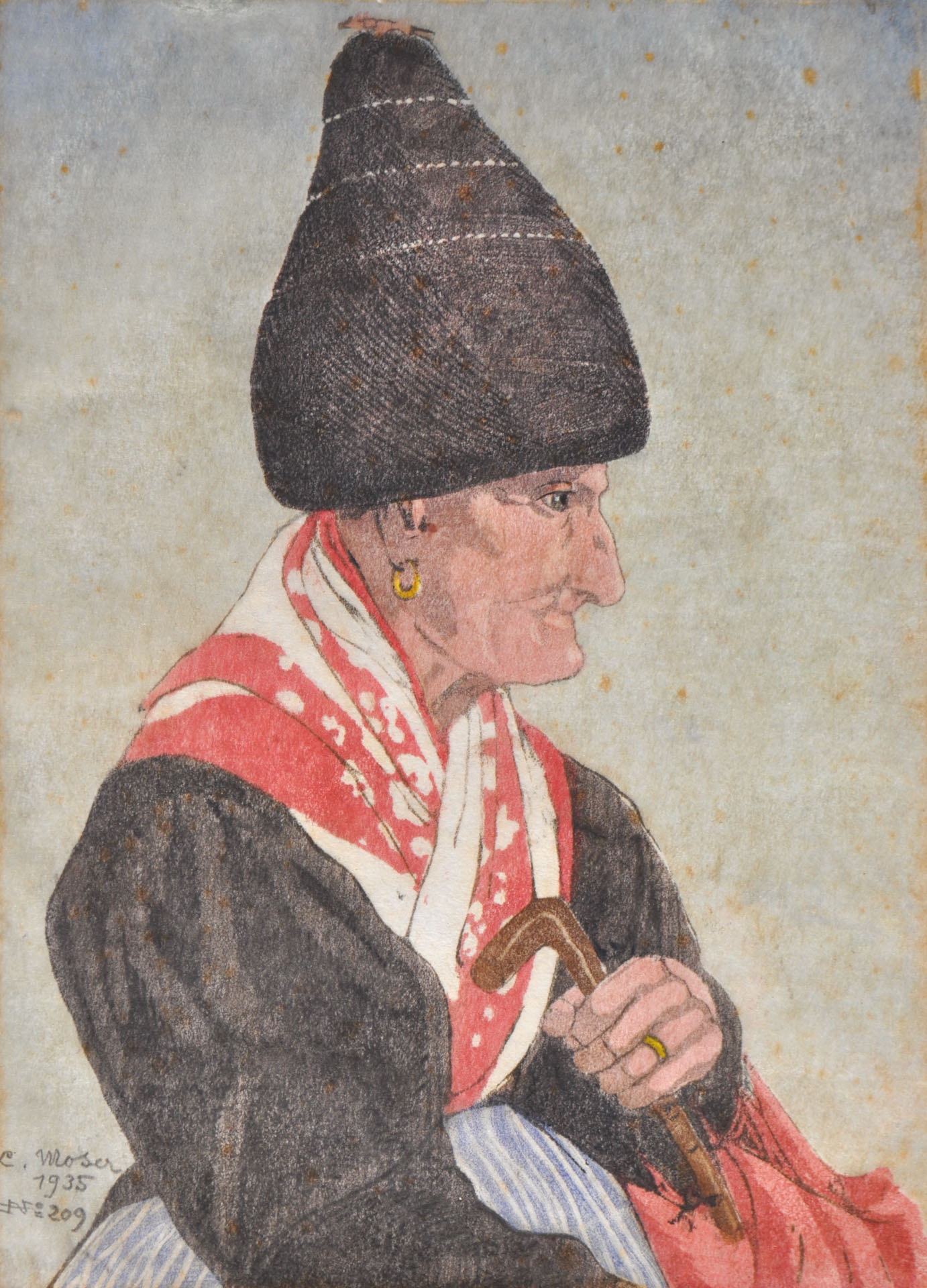 Carl Moser (Bozen/Bolzano 1873-1939) Donna di Castelrotto, 1932;Xilografia a colori, 37 x 27 cm, macchie, in cornice