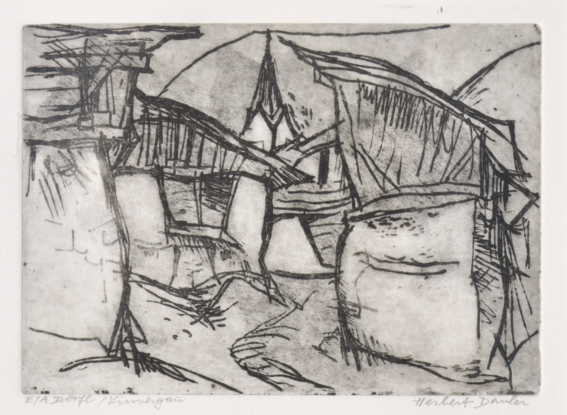 Herbert Danler (Fulpmes 1928 - Telfes im Stubaital 2011) Dörfl, Val Venosta, 2000 ca.;Acquaforte, 13,5 x 18,7 cm (lastra), in cornice