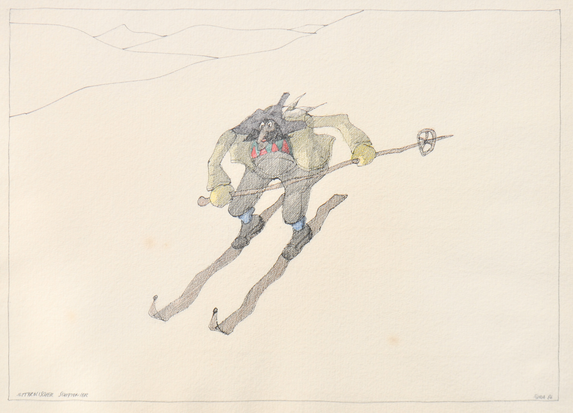 Paul Flora Glurns/Glorenza 1922 - Innsbruck 2003) Pioniere dello sci del Vecchio Tirolo, 1986;China e matite colorate, 26,7 x 36,7 cm (entro il pasepartout),