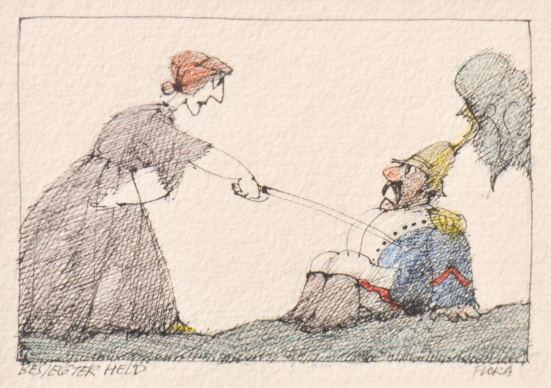 Paul Flora Glurns/Glorenza 1922 - Innsbruck 2003) Eroe sconfitto;China e matite colorate, 7 x 10 cm (entro il passepartout),