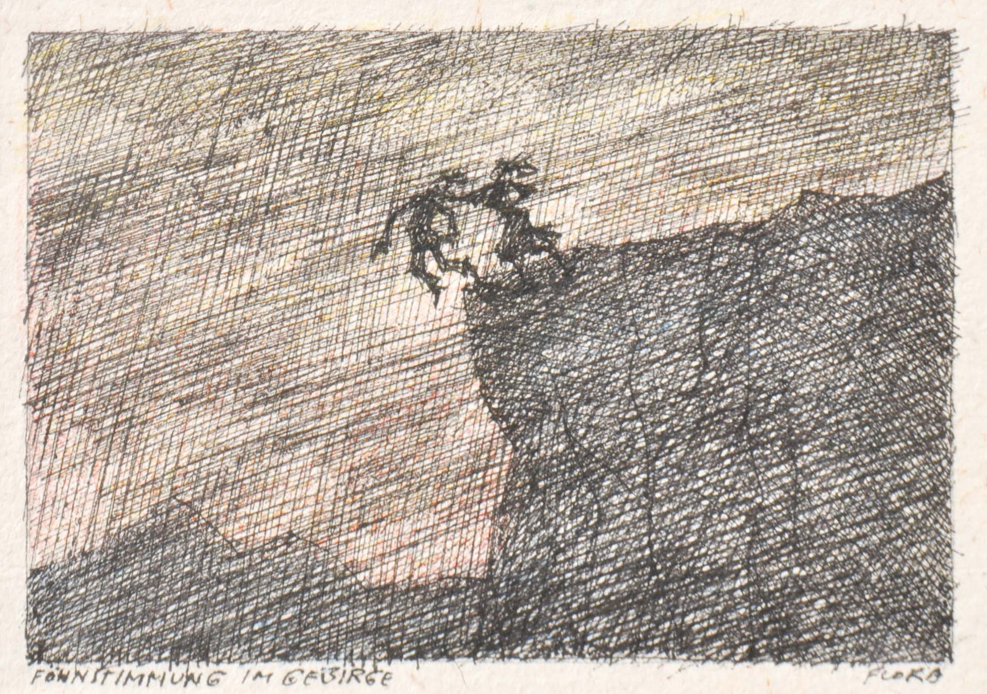 Paul Flora Glurns/Glorenza 1922 - Innsbruck 2003) Atmosfera con Foehn in montagna;China e matite colorate, 7 x 10 cm (entro il passepartout),