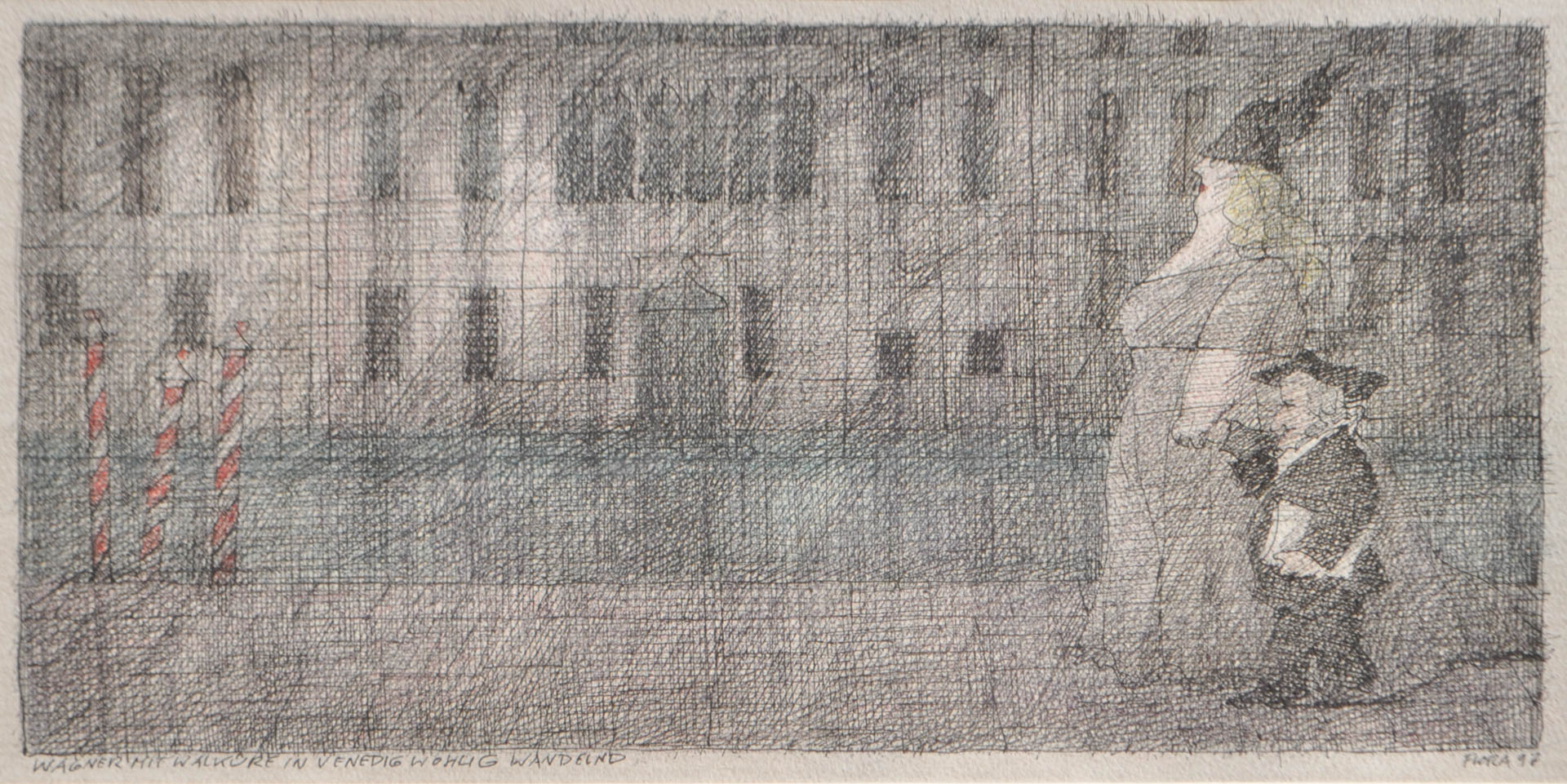 Paul Flora Glurns/Glorenza 1922 - Innsbruck 2003) Wagner che cammina comodamente con la Walkirie a Venezia, 1997;China e matite colorate, 15 x 30 cm (entro il passepartout),
