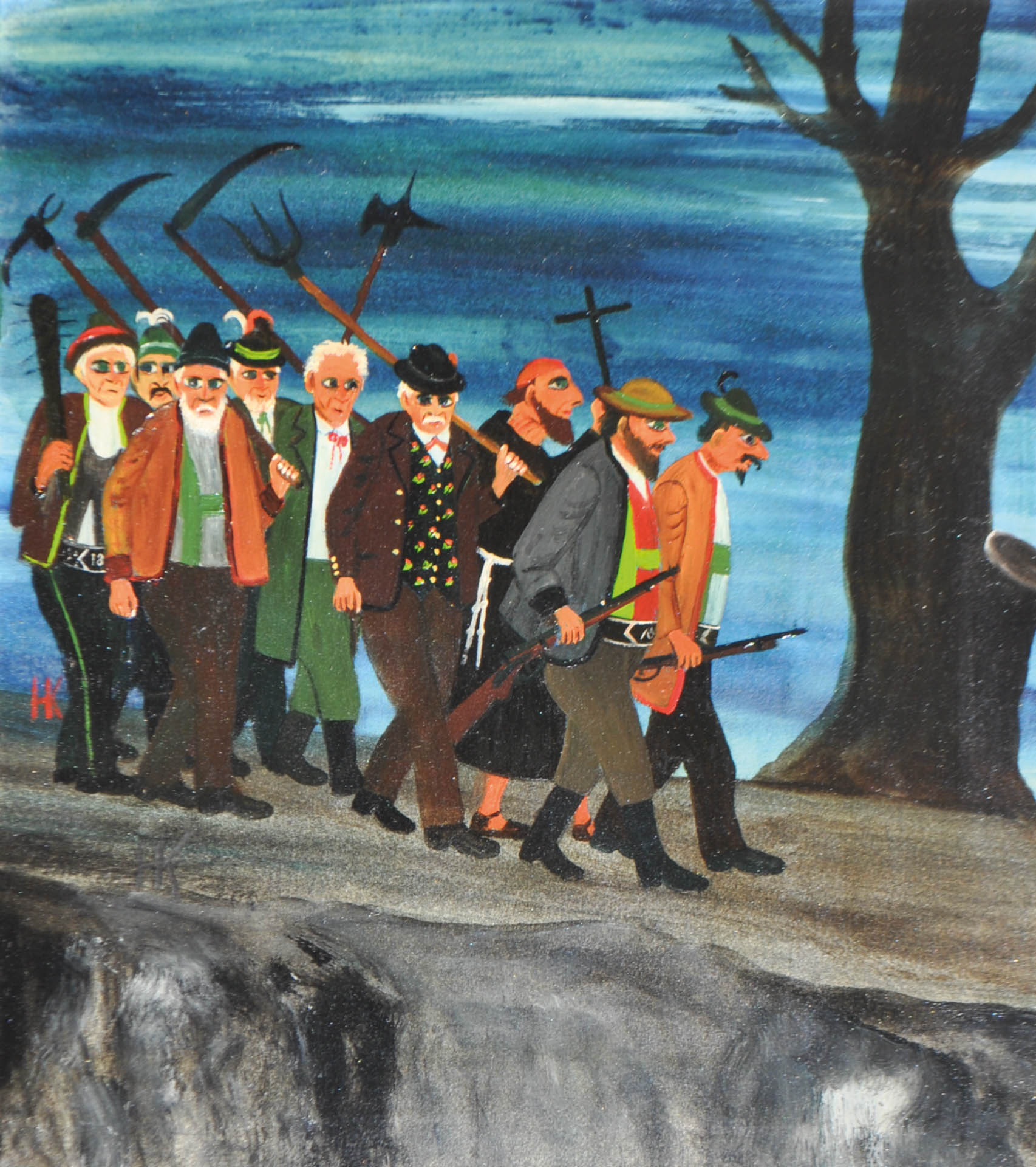 Hans Kompatscher (Völser Aicha 1906 -Bozen/Bolzano 1988) L'ultimo contingente, 1981 ca.;Olio su cartone, 28 x 25 cm, in cornice