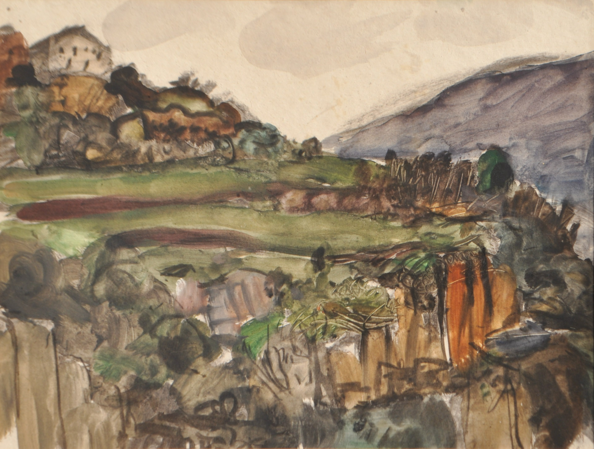 Anton Frühauf (Meran/Merano 1914 - 1999) Paesaggio vicino a Merano;Tecnica mista su carta, 28,5 x 38,5 cm, in cornice