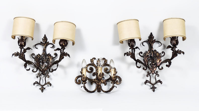 COPPIA DI APPLIQUES IN METALLO DORATO - PAIR OF GILDED METAL WALL LAMPS due bracci portacandele ed una simile a tre bracci h cm 43, h cm 28 (3)
