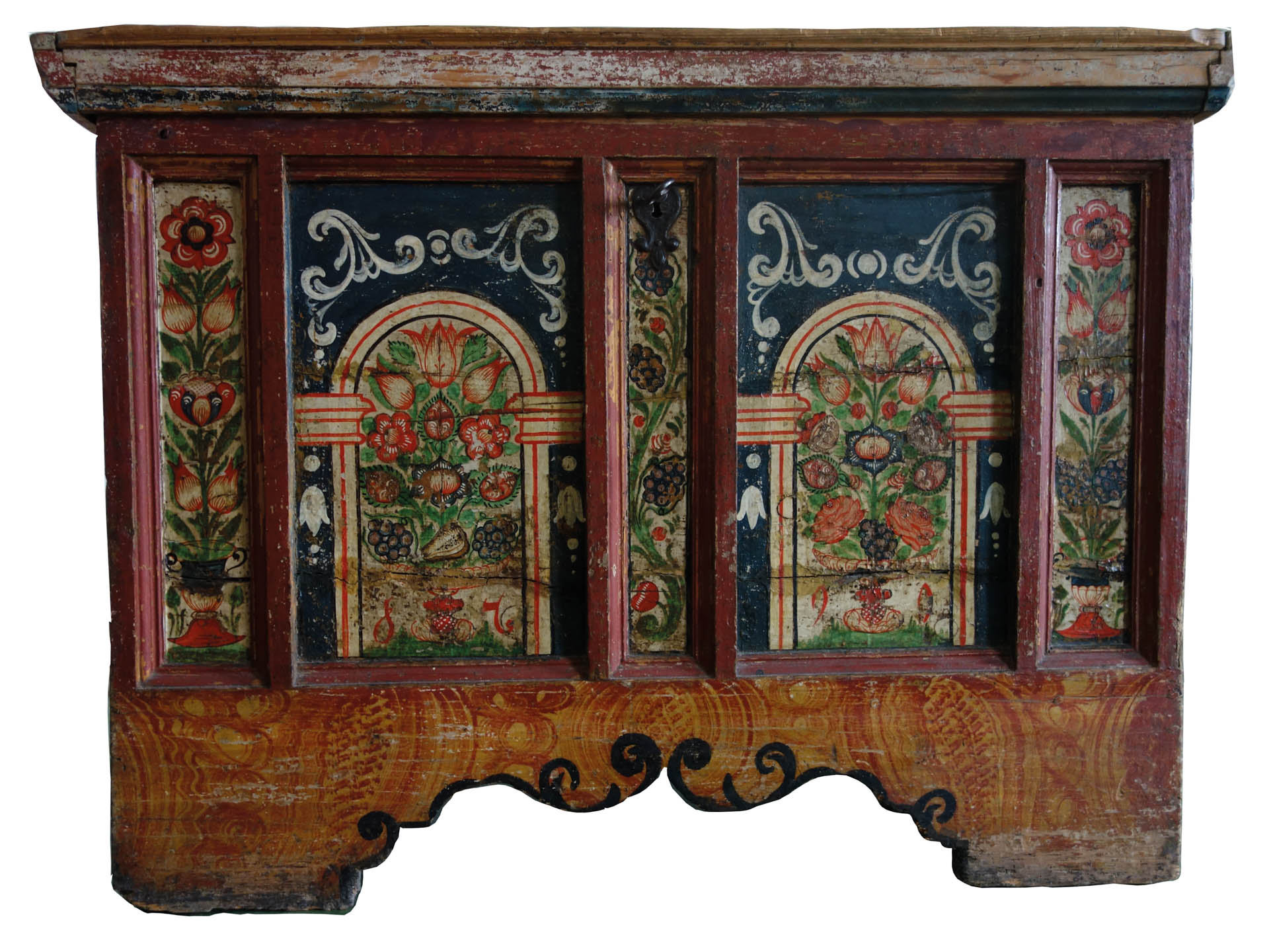 Anonym/anonimo Cassettone della valle Zillertal in blu, XVIII secolo;Piccola cassapanca a piedistallo con due ripieni floreali ad arco