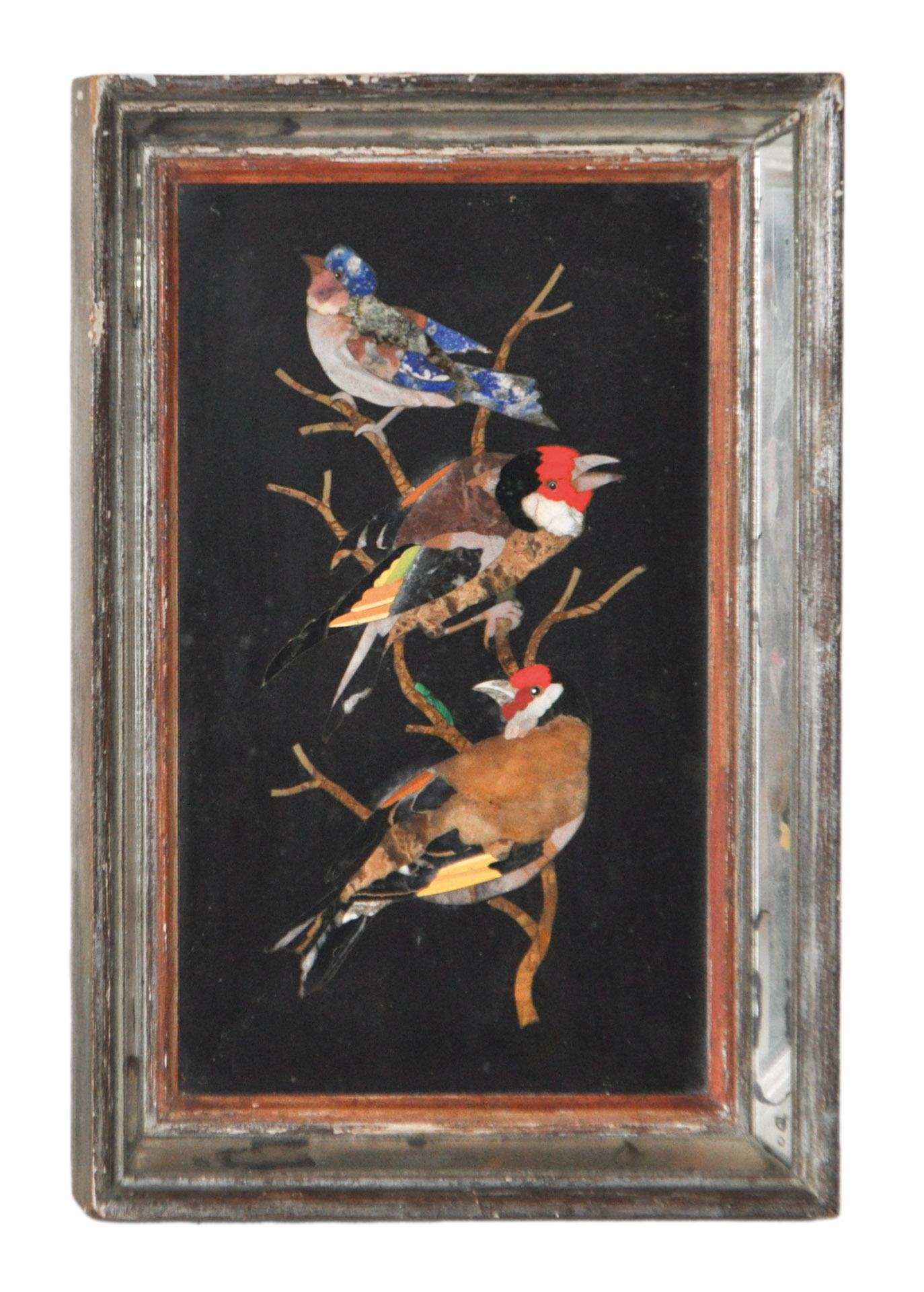 Anonym/anonimo Opera in pietra dura "Tre uccelli tra i rami";23 x 14,2 cm, cornice a specchio