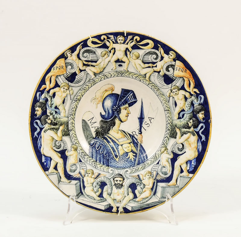 PIATTO DA PARATA IN CERAMICA SMALTATA - GLAZED TERRACOTTA PLATE inizio del XX secolo - early 20th Century dipinto sul fondo con busto della guerriera Marfisa, la tesa ornata con puttini, figure maschili e animali fantastici su fondo blu diam cm 30