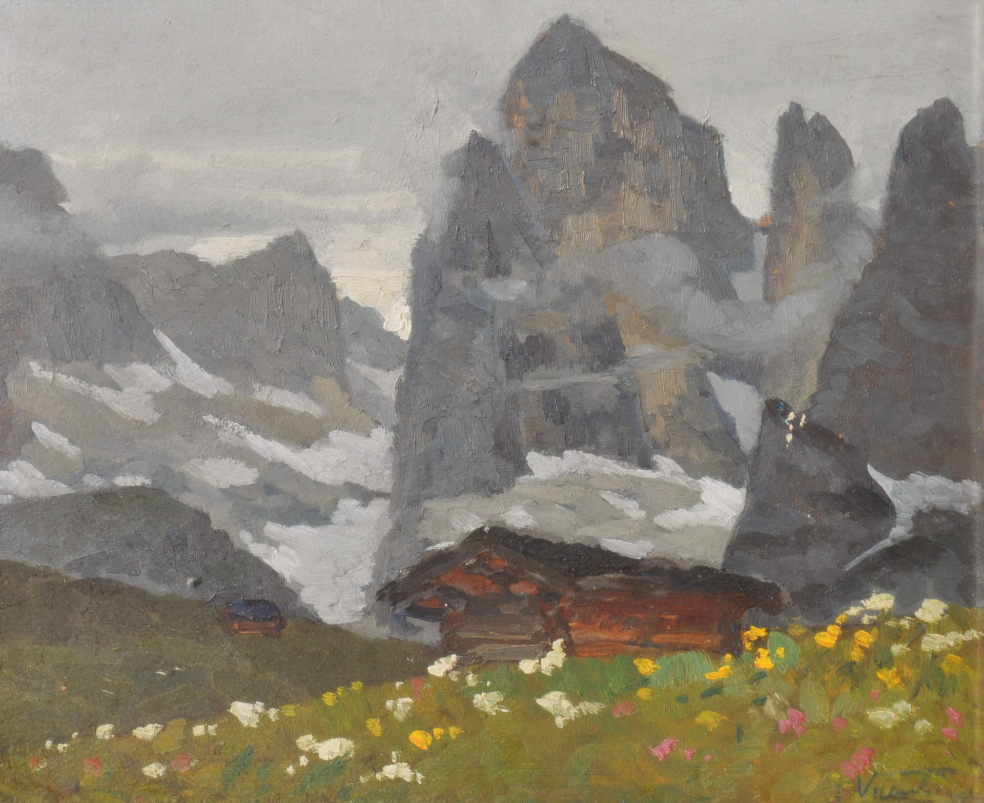 Luigi Vicentini (Pomarolo 1901 - Nomi 1970) Passo Pordoi;Olio su cartone, 28,5 x 39 cm, in cornice