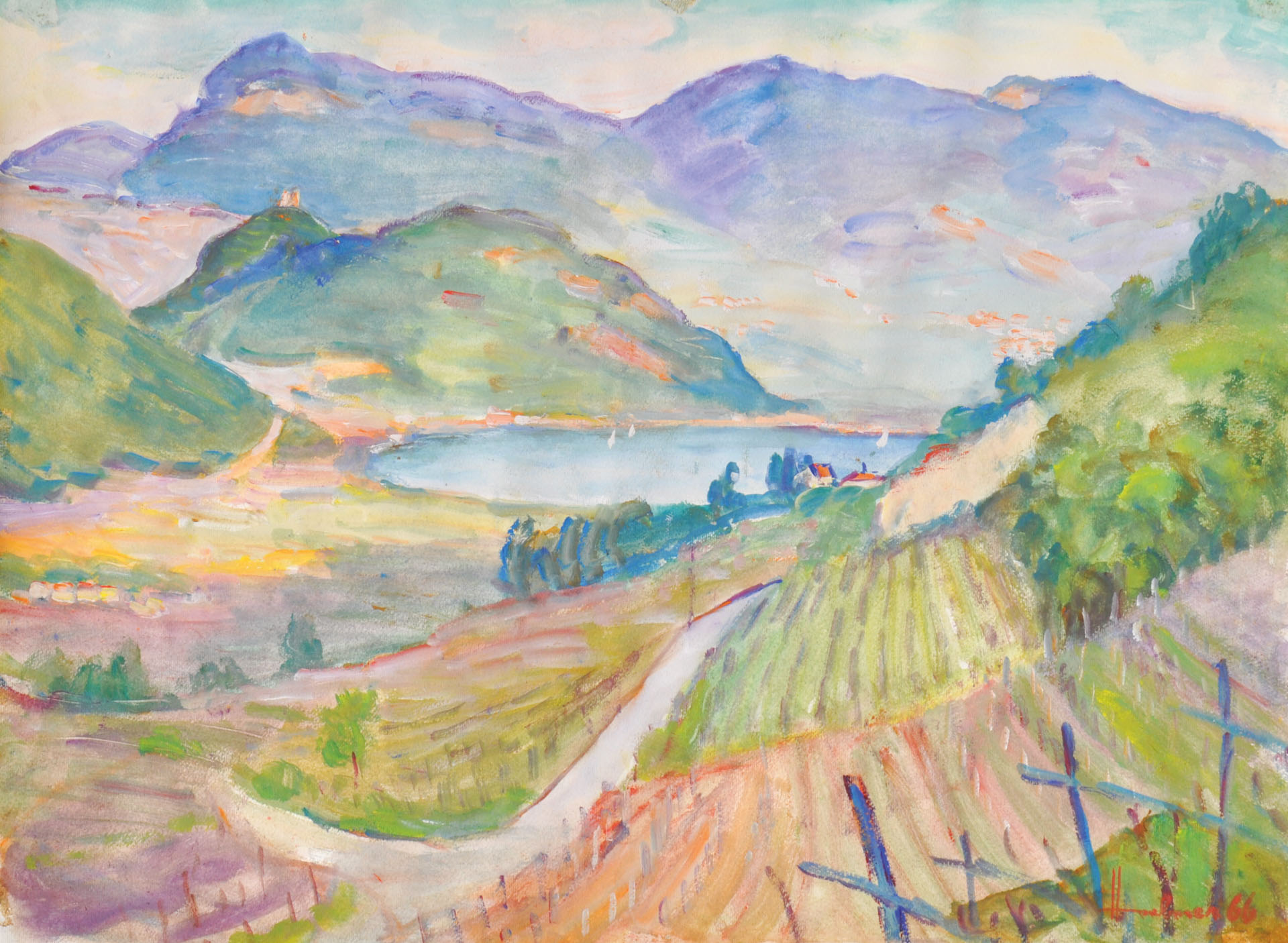 Südtiroler Maler des 20. Jh./Pittore altoatesino del XX secolo Lago di Caldaro, 1966;Guazzo, 33 x 43 cm, in cornice