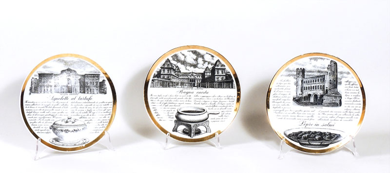 SERIE DI TRE PIATTI IN PORCELLANA BAVARESE - A SET OF THREE BAVARIAN PORCELAIN PLATES Piero Fornasetti, Milano, 1960 circa decorati in monocromia nera con vedute di monumenti e ricette di specialità culinarie torinesi, bordi dorati diam cm 24,5 Iscritti al verso: Specialità Torinesi-Serie specialmente eseguita per la Fiat da Piero Fornasetti