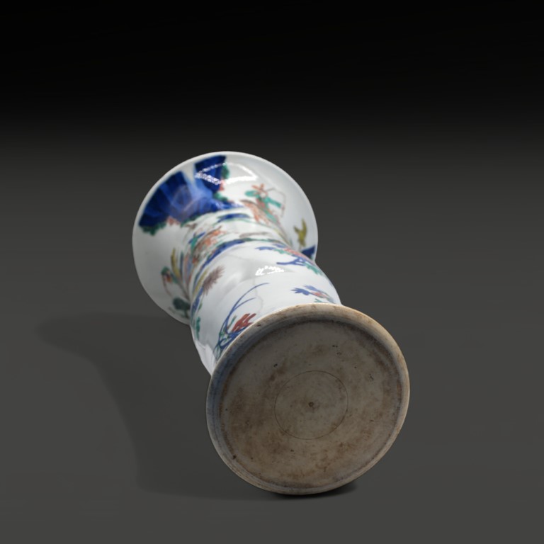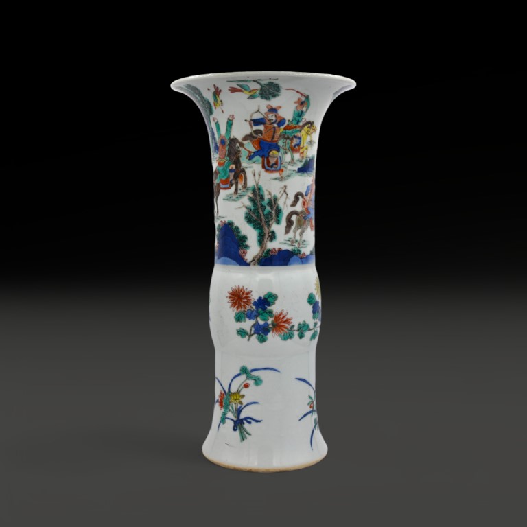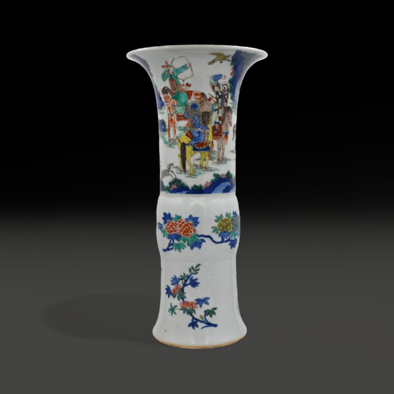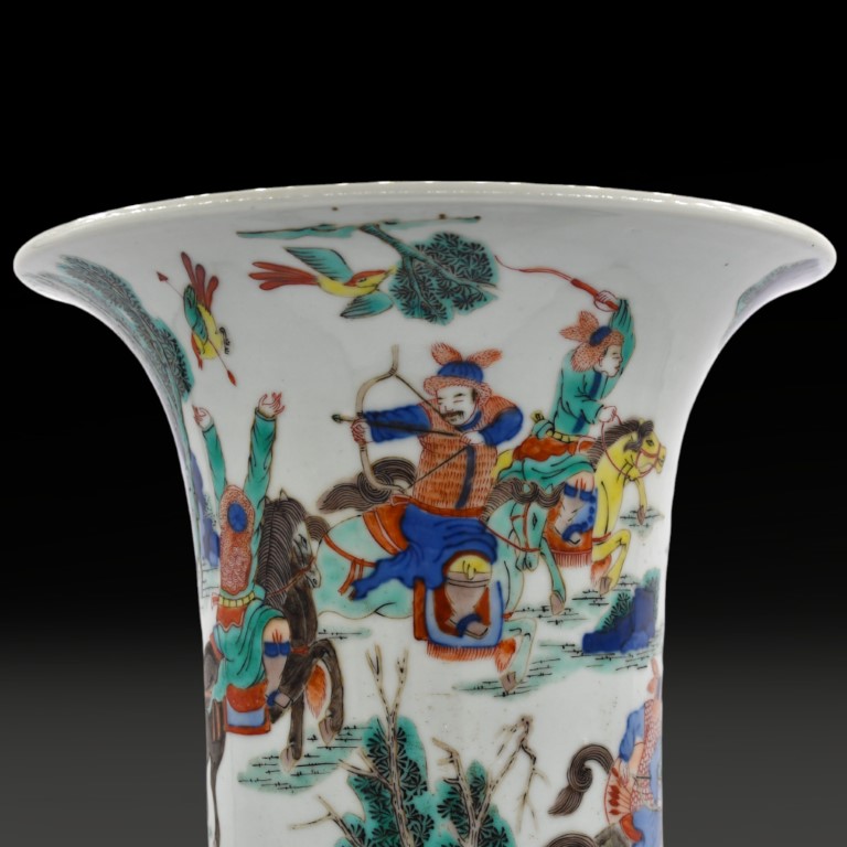 heavy potted porcelain vase painted in five colors palette with hunting scene.