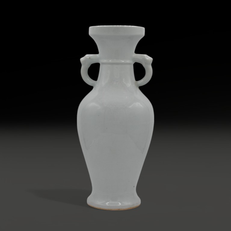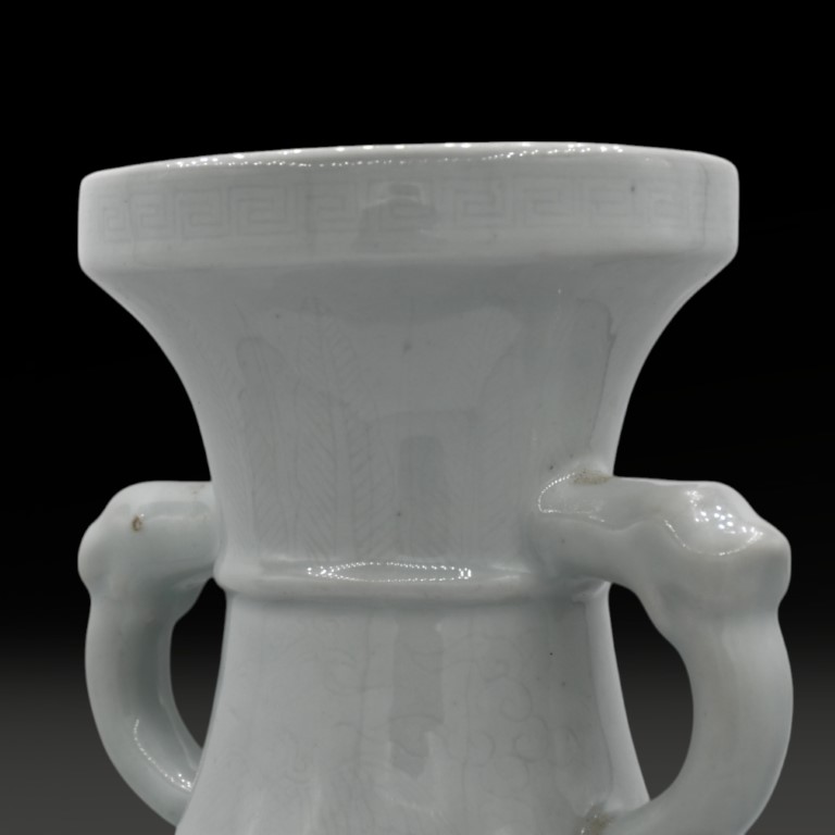 large white porcelain baluster vase with zoomorphic handles and underglaze engraved motif of dragons and waves. On the bottom apocryphal Ming mark.