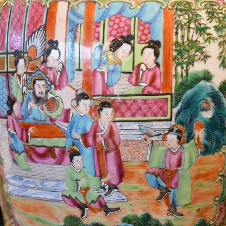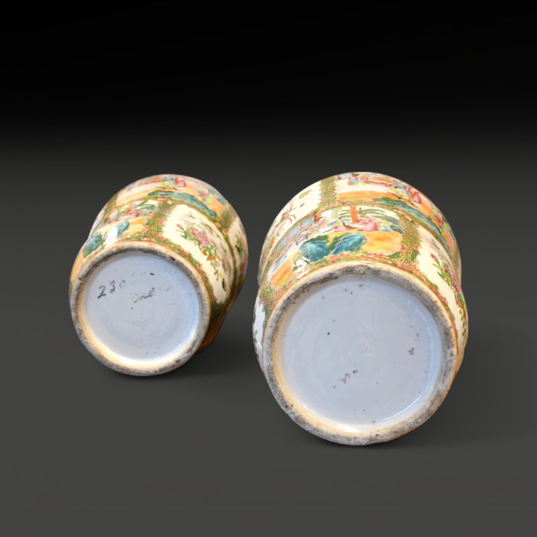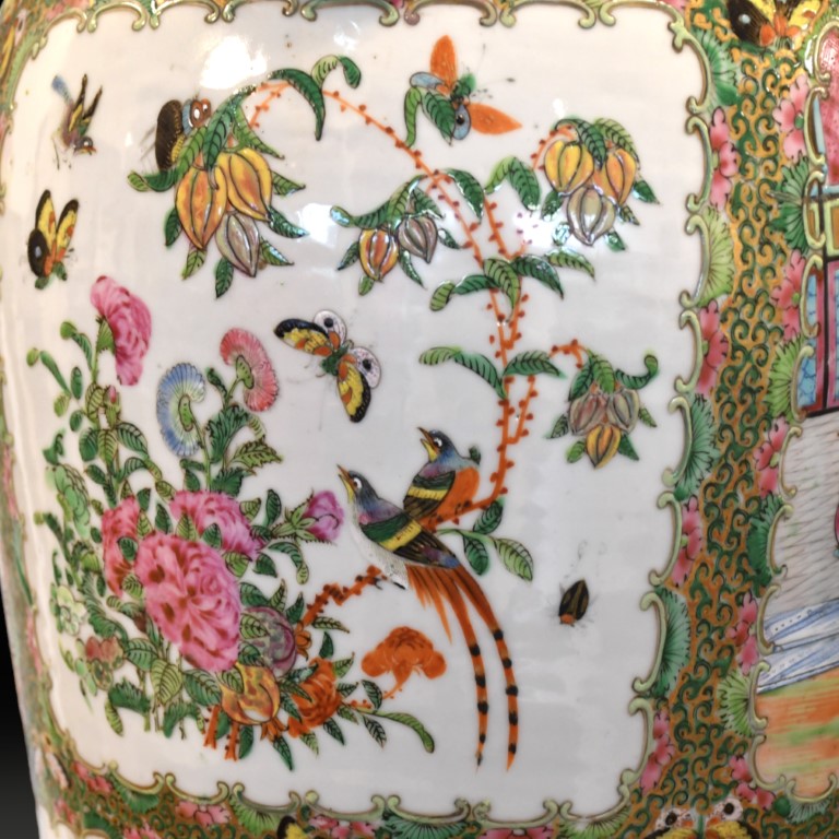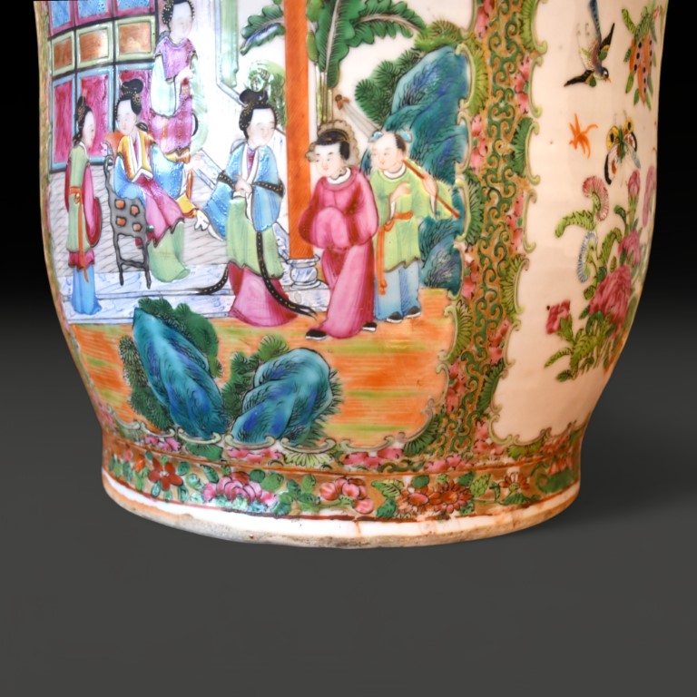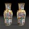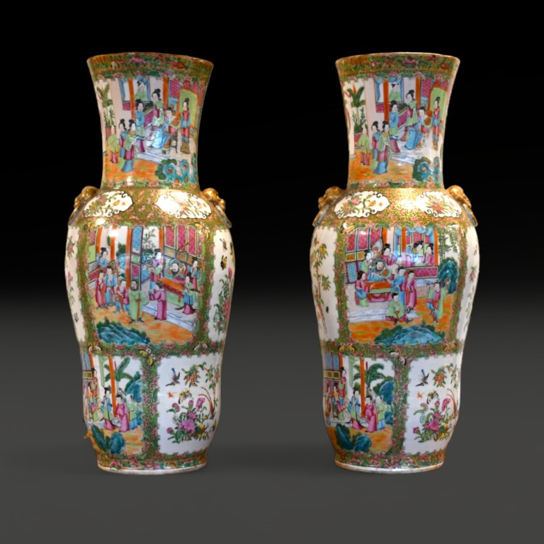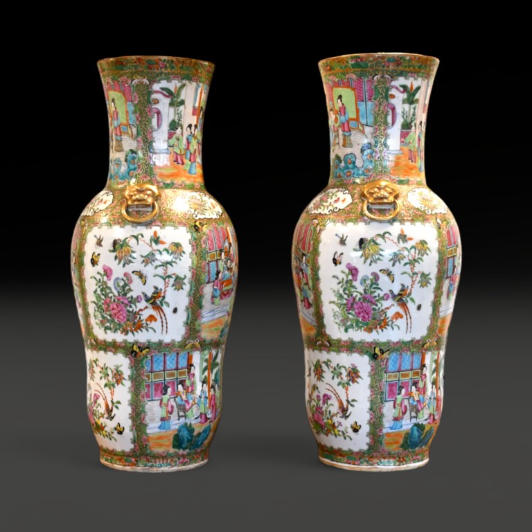 an impressive pair of Famille Rose Canton vases decorated with flowers and figures within cartouche.