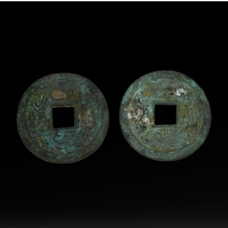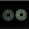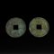 two cast bronze coins with inscriptions and phoenixes and dragons.