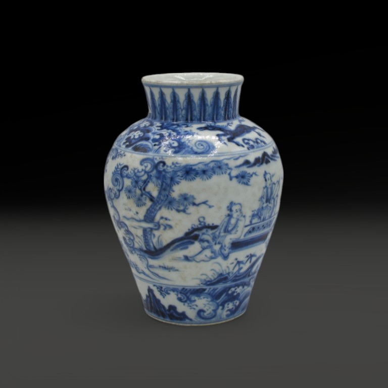 heavy potted blue and white porcelain body decorated with sages in countryside. On the bottom apocryphal mark of Xuande.