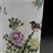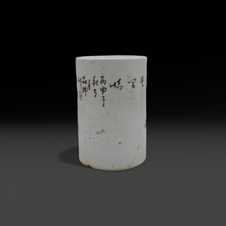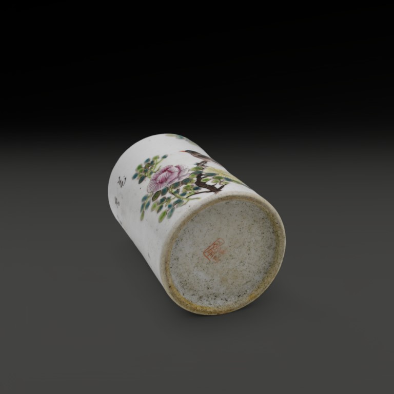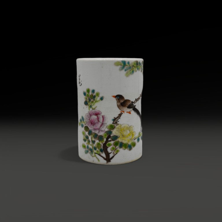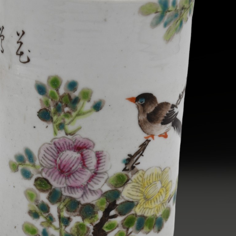 cylindrical Famille Rose porcelain brush pot with birds, flowers and calligraphy.