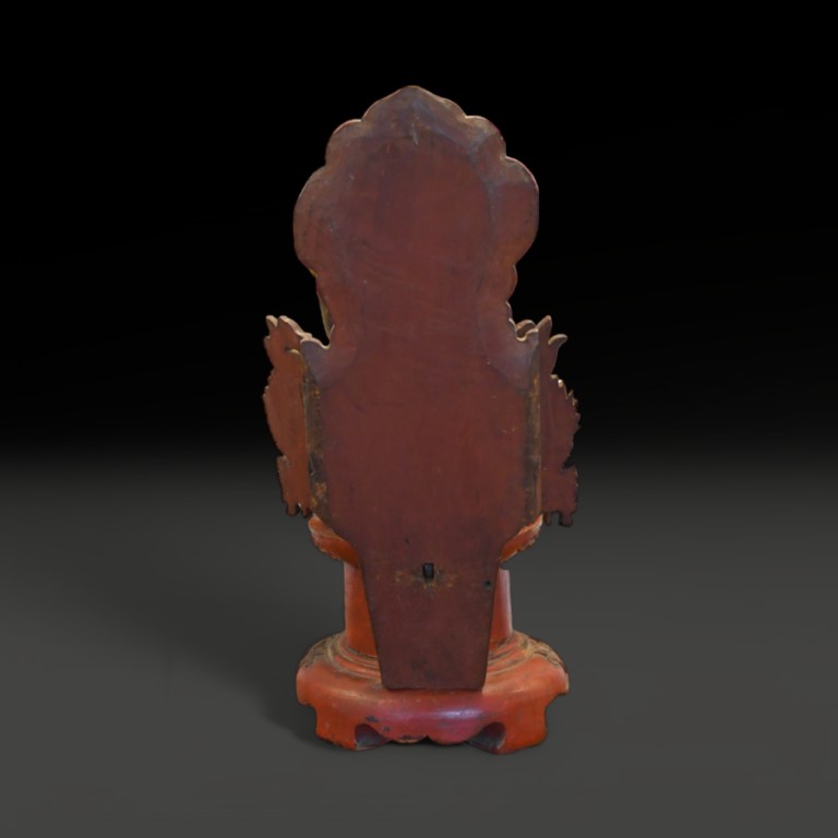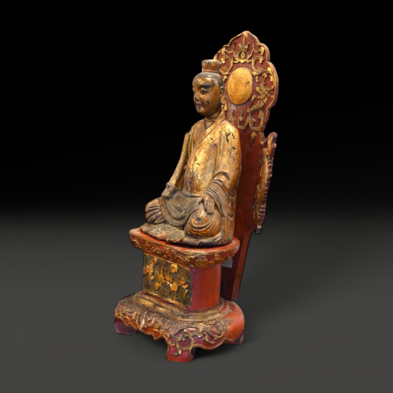 a lacquered parcel gilt figure depicting a Taoist deity seated on high pedestal.