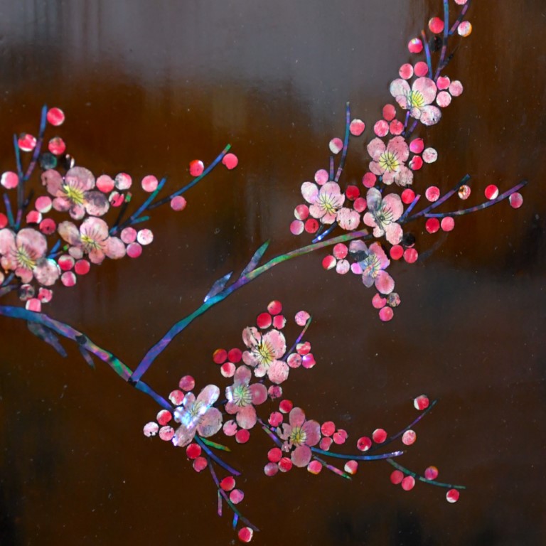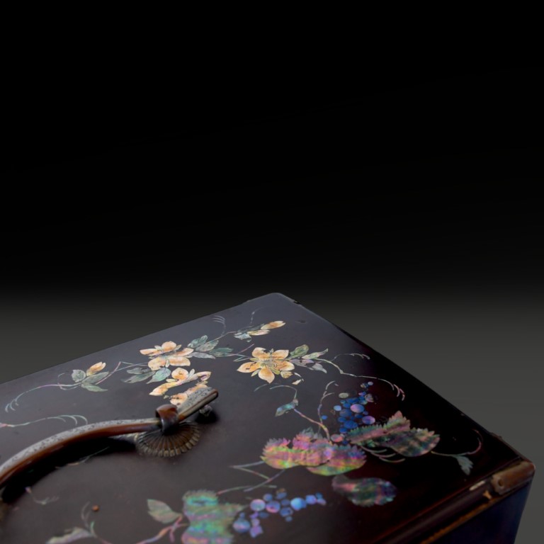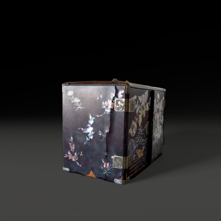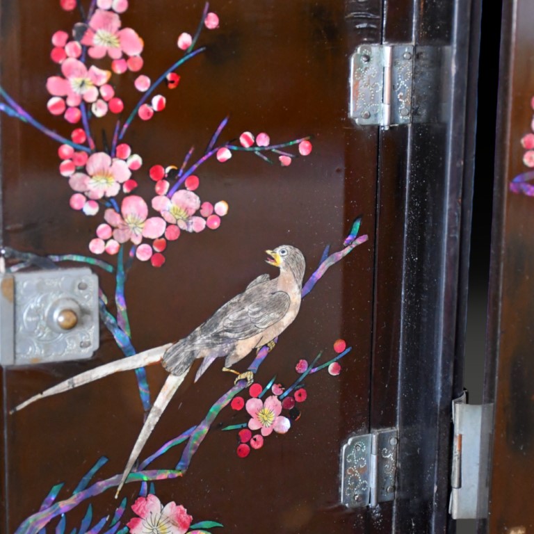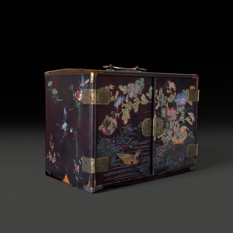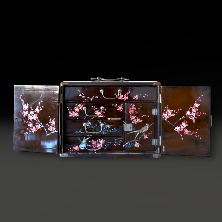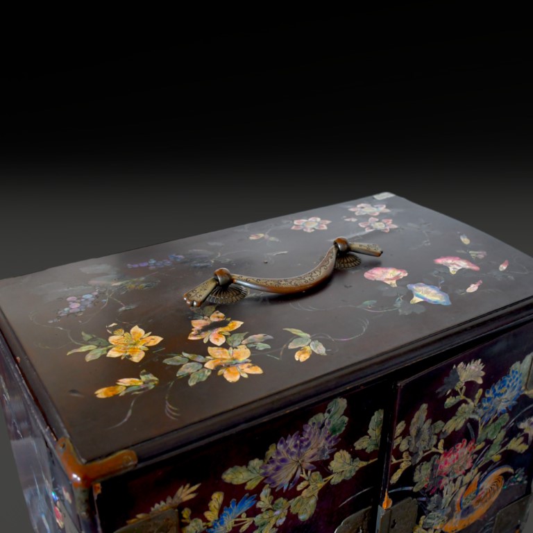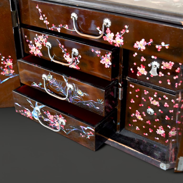 a fine Shibayama cabinet with six drawers, copper handles and fittings.