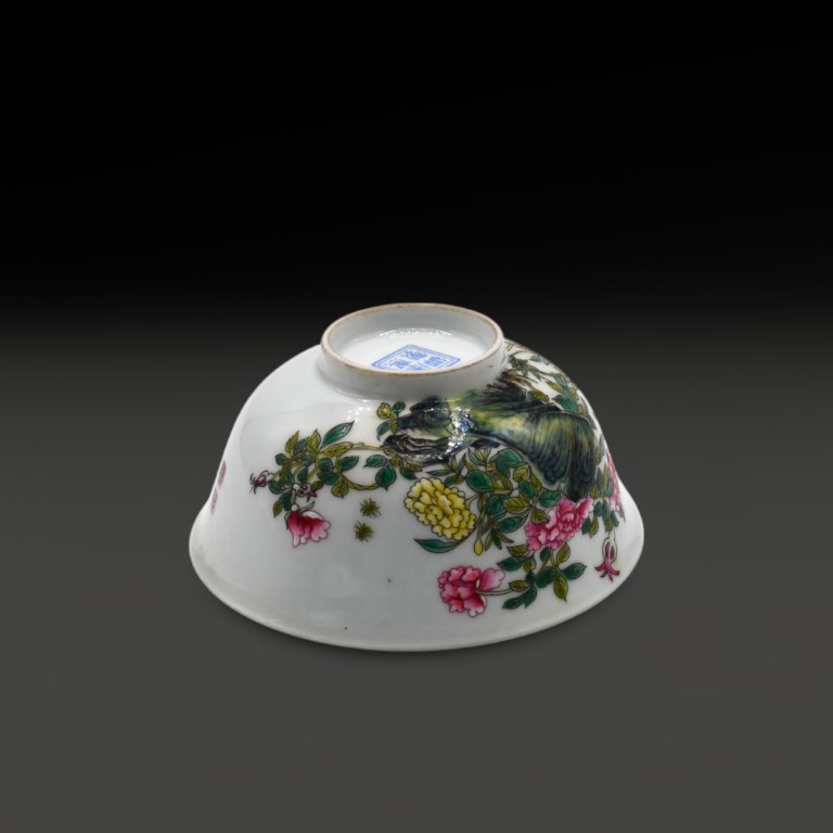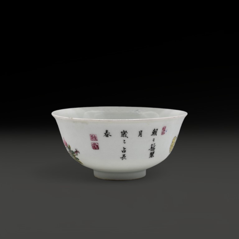 white porcelain body with Famille Rose decor of rocks and peonies and calligraphic inscription. On the bottom Zuanshu mark.