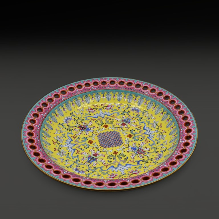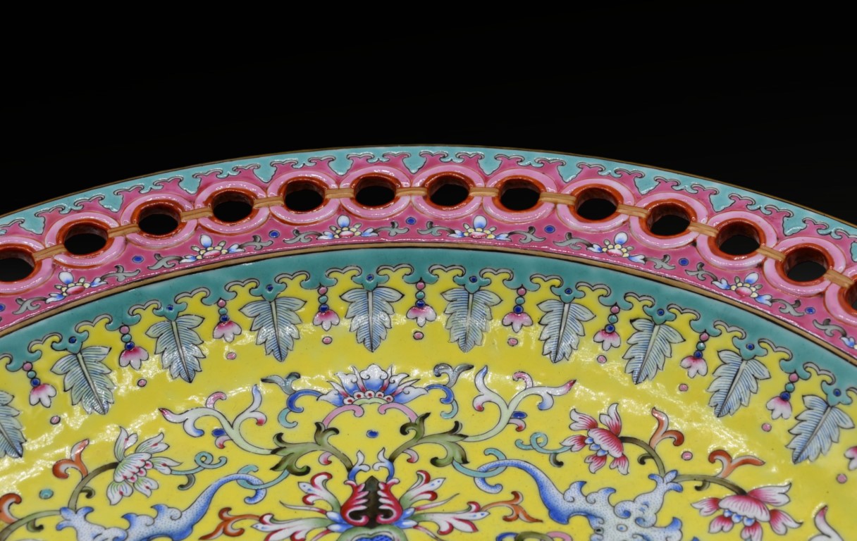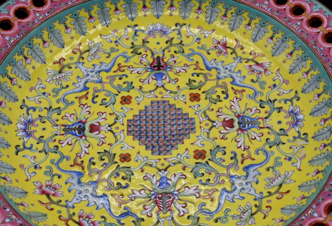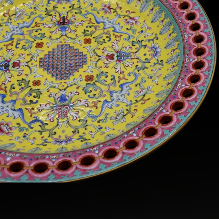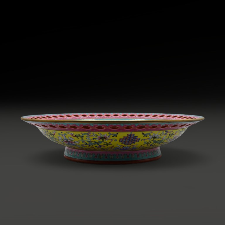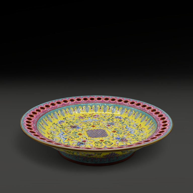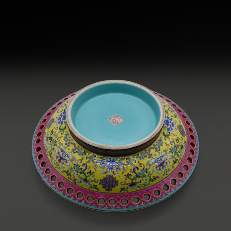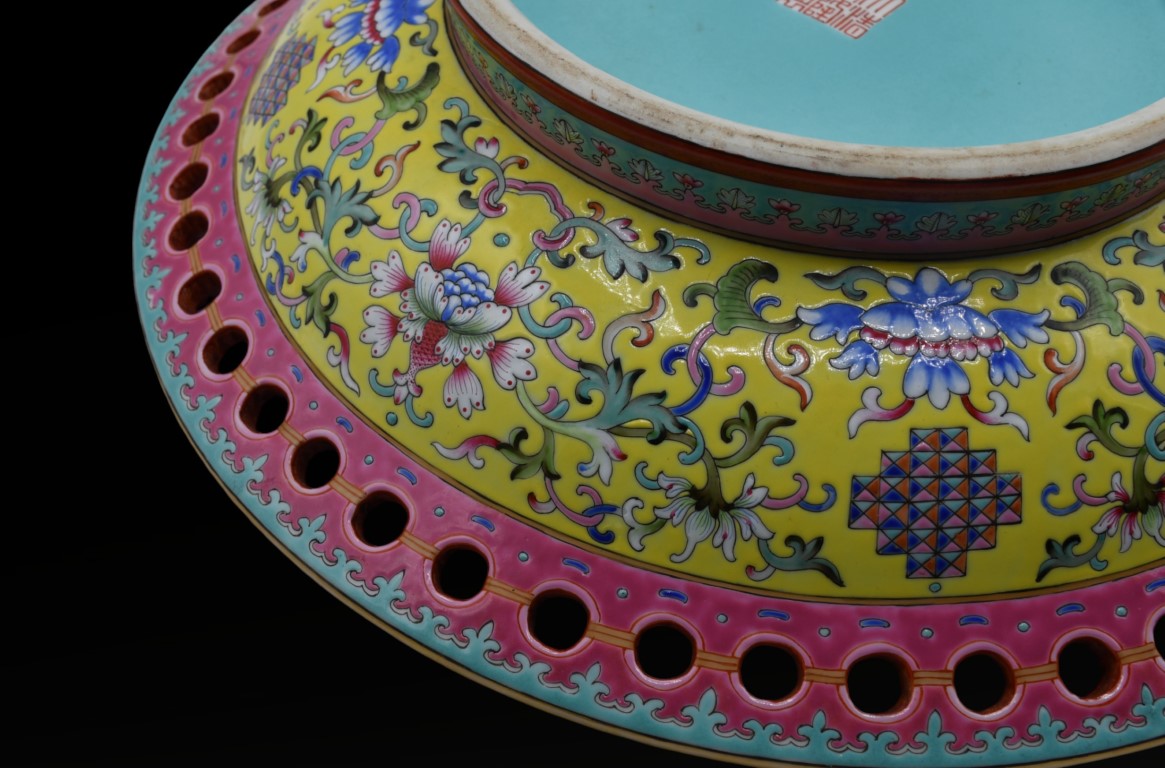 decorated with bats and flowers on a yellow ground and pierced rim. On the bottom apocryphal mark of Qianlong.