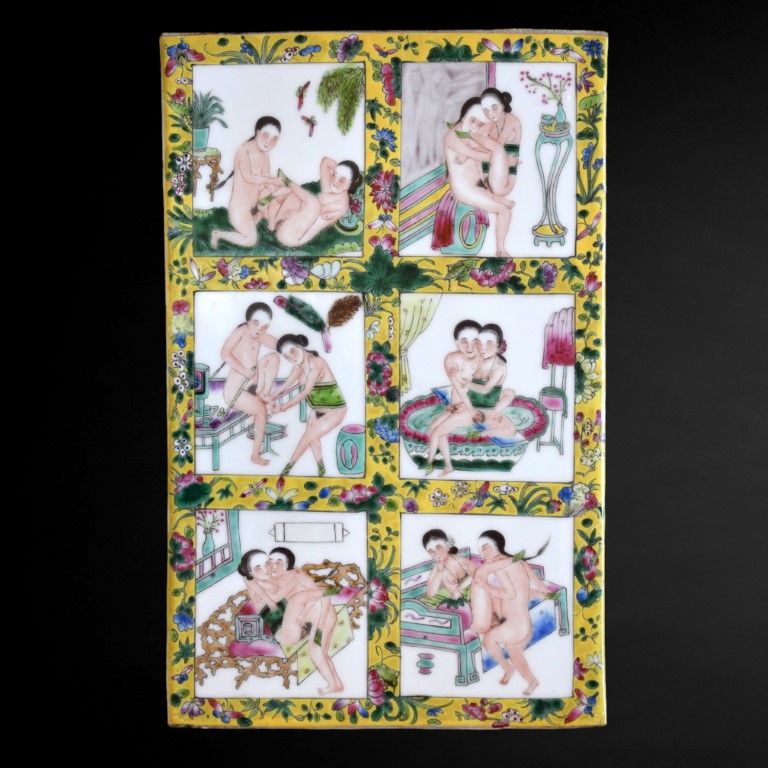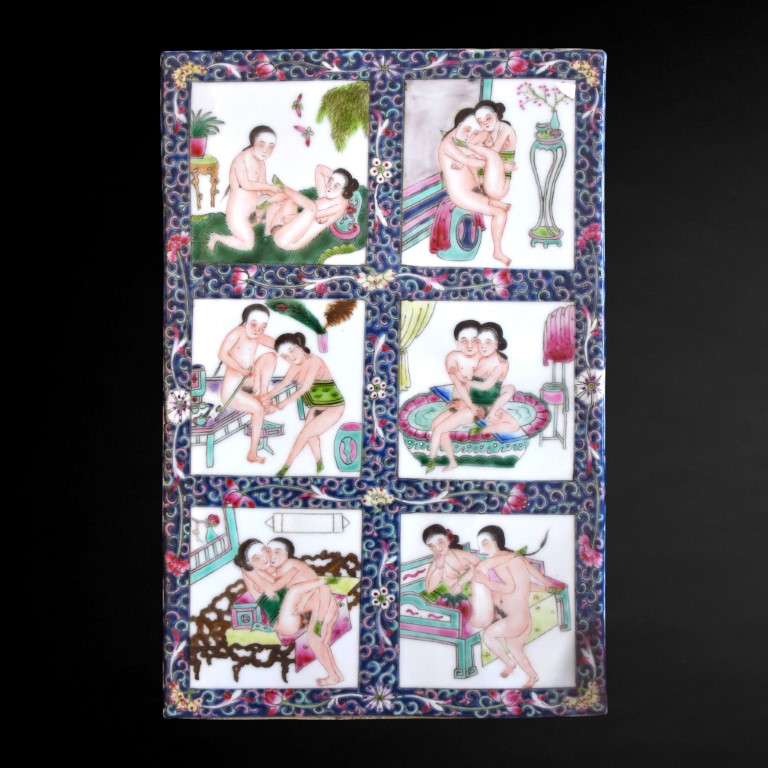 lot consisting of two porcelain plaques with six erotics scenes each of different floral ground within reserves.