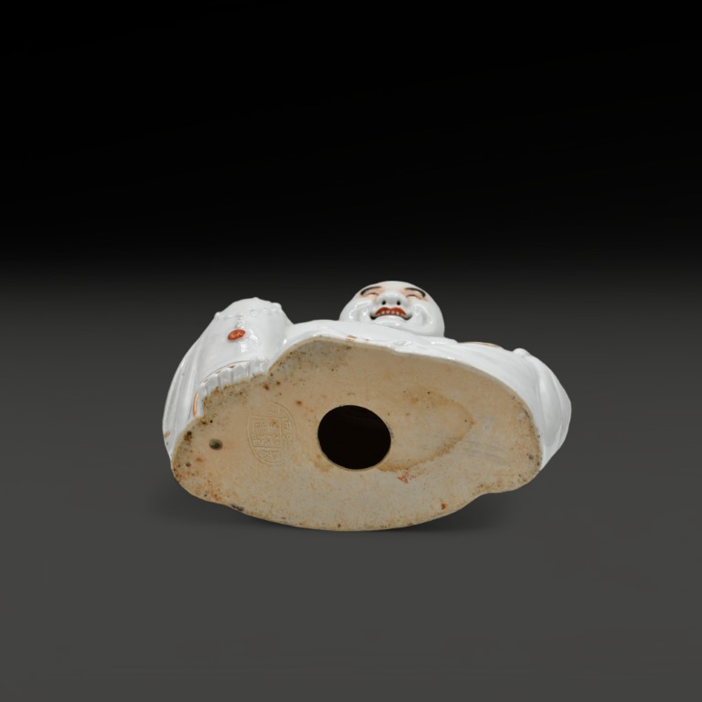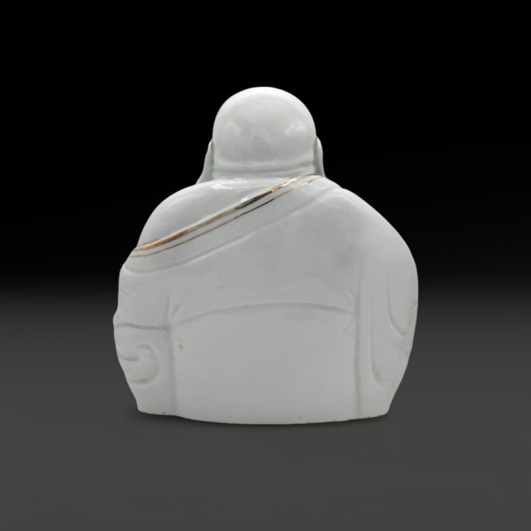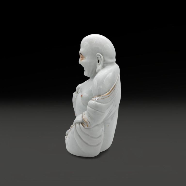 the 'smiling Buddha' seated in white porcelain. On the bottom impressed seal mark.
